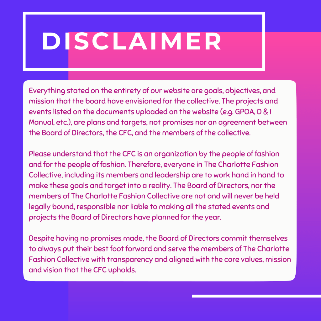 The Charlotte Fashion Collective has partnered with Termly.io to provide you the CFC’s Terms of Use which has been put in place to provide protection to (2) two our main domains, namely (www.thepeopleoffashion.com) and (thecharlottefashioncollective.com).